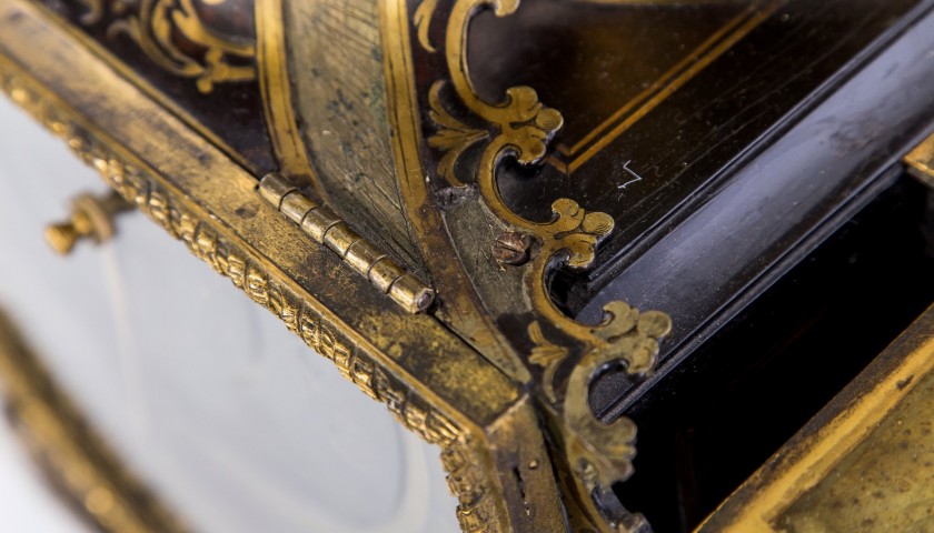 Boulle items frequently come into our workshop with significant lifting or missing brass, tortoiseshell or pewter. When we lift and re-lay we take utmost care to ensure that the colour, surface finish and patina is maintained across all surface areas by avoiding heat in the process.